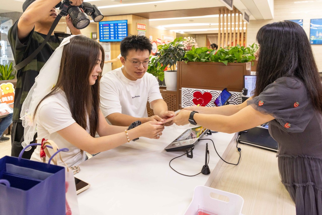 9月9日上午,江北区婚姻登记处大厅内洋溢着喜庆与温情。一对对新人办理结婚登记时,不仅感受到精心布置的浪漫氛围,还被一面“赠人玫瑰,手有余香”的慈善主题爱心打卡墙吸引。“这个手工花真好看,等会我们也来拍照!”张女士拉着丈夫的手欣喜地说道。